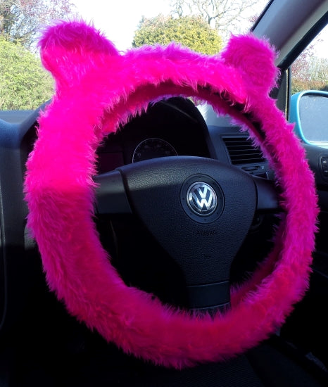 Protect your steering wheel and show your fun personality with this bright pink fuzzy steering wheel cover with ears.