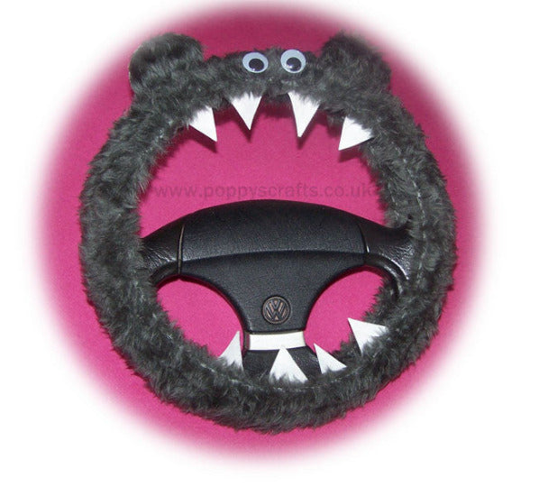 Bring fun and personality to your car with this handmade monster steering wheel cover, crafted from soft dark grey short-pile faux fur. Designed with playful googly eyes, felt teeth, and fuzzy ears, this unique accessory adds a touch of humor and coziness to your car.