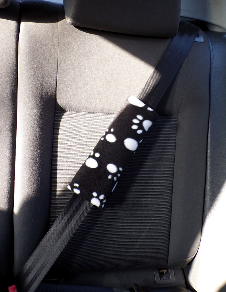 These Black and White paw print fleece car seatbelt pads are the perfect gift for animal enthusiasts!