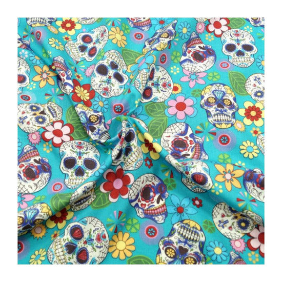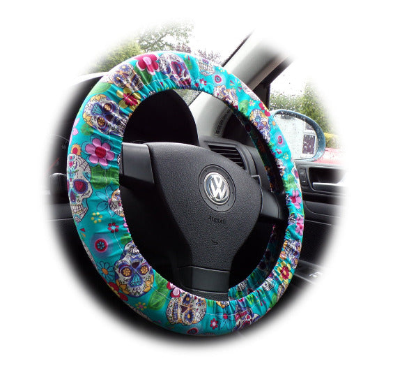 Sugar Skulls and flowers on Turquoise print cotton car steering wheel cover