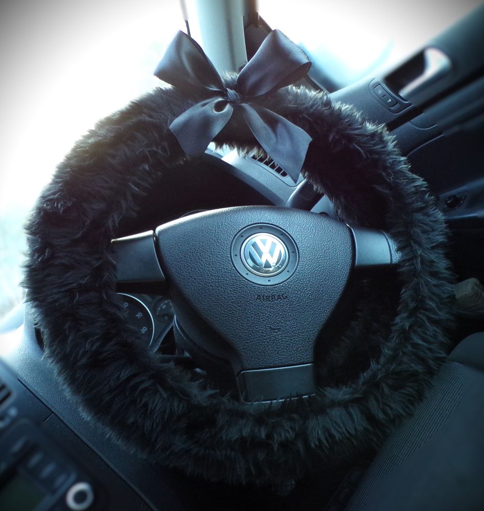 Black fluffy faux fur car steering wheel cover with Black satin Bow