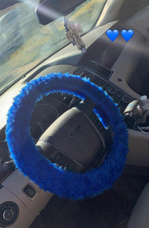 Style up your ride with this sensational royal blue faux furry steering wheel cover!